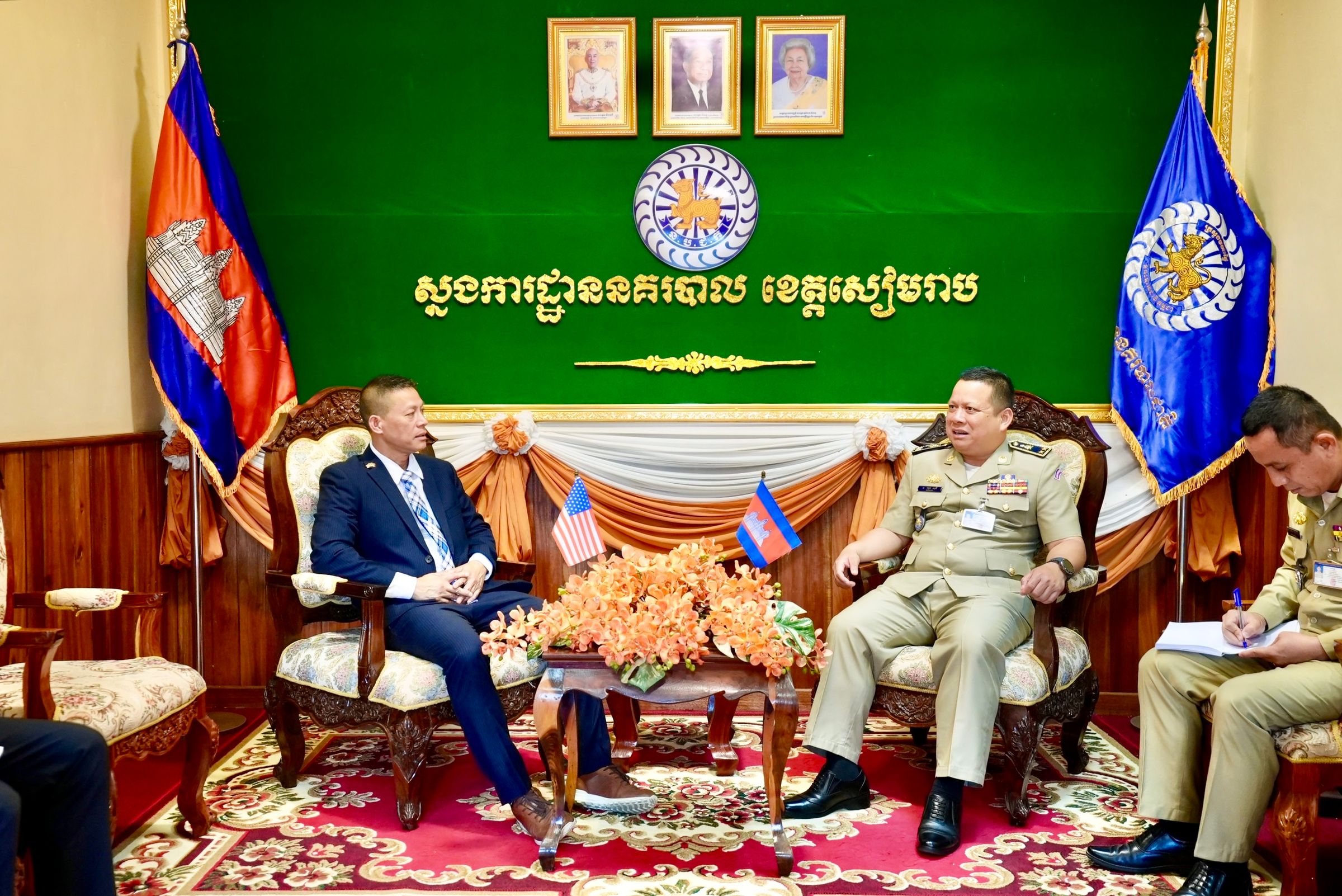សៀមរាប ៖ នៅរសៀលថ្ងៃព្រហស្បតិ៍ ទី២៦ ខែកុម្ភៈ ឆ្នាំ២០២៦ ដោយអនុវត្តតាមការចង្អុលដឹកនាំដ៏ខ្ពង់ខ្ពស់របស់ ឯកឧត្តម នាយឧត្តមសេនីយ៍ ស ថេត អគ្គស្នងការនគរបាលជាតិ លោកឧត្តមសេនីយ៍ទោ ហួត សុធី ស្នងការ នៃស្នងការដ្ឋាននគរបាលខេត្តសៀមរាប បានអញ្ជើញដឹកនាំសហការី ទទួលជួបសម្តែងការគួរសម និងពិភាក្សាការងារជាមួយ លោក ចៅ សម្បត្តិ សេនានុព័ន្ធរងប្រចាំប្រទេស នៃទីភ្នាក់ងារអនុវត្តច្បាប់ប្រឆាំងគ្រឿងញៀន ប្រចាំការនៅស្ថានទូតអាមេរិក រាជធានីភ្នំពេញ នៅស្នងការដ្ឋាននគរបាលខេត្ត៕