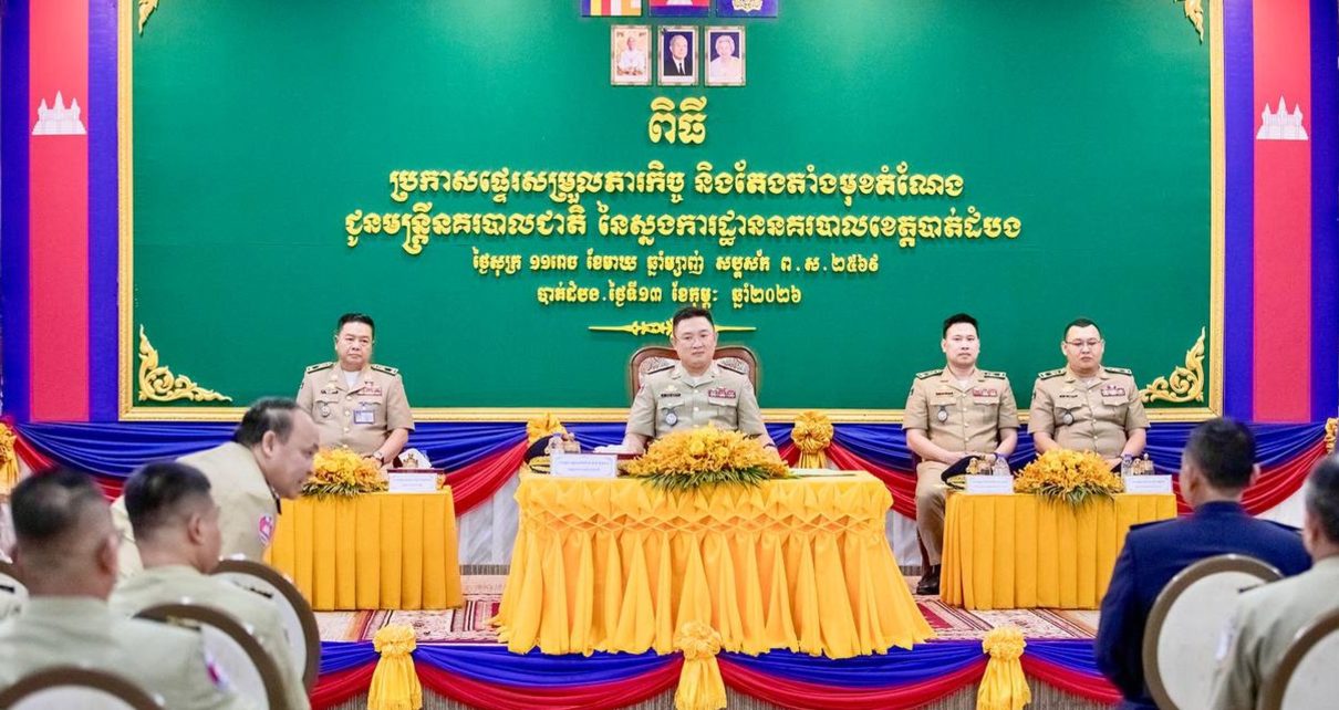 ខេត្តបាត់ដំបង៖ នារសៀលថ្ងៃទី១៣ ខែកុម្ភៈ ឆ្នាំ២០២៦ នៅបរិវេណស្នងការដ្ឋាននគរ បាល ខេត្តបាត់ដំបង ដោយបានការអនុ ញ្ញាតដ៏ខ្ពង់ ខ្ពស់ពីឯកឧត្តម នាយឧត្តម សេ នីយ៍ ស ថេត អគ្កស្នងការនគរបាលជាតិ ឯកឧត្តម ឧត្តមសេនីយ៍ឯក តាន់ សំណាង អគ្គស្នងការរងនគរបាលជាតិ តំណាង ឯកឧត្តម នាយឧត្តមសេនីយ៍ អគ្គស្នងការនគរបាលជាតិ អញ្ជើញជាអធិ បតីប្រកាសផ្ទេរសម្រួលភាកិច្ច និងតែងតាំងមុខតំណែងជូនមន្រ្តីនគរបាលជាតិនៃស្នងការដ្ឋានន គរបាលខេត្តបាត់ដំបង។ ចូលរួមក្នុងពិធីនេះមានអស់លោកជាប្រតិភូអមដំណើរ ជាប្រធាននាយក ដ្ឋានការពារ ជានាយការិយល័យបុគ្គ លិកនៃអគ្គស្នងការដ្ឋាននគរបាលជាតិ លោកស្នងការ លោក លោកស្រីស្នង ការរង នាយការិយាល័យជំនាញ មេ បញ្ជាការវរសេនាតូចនគរបាលការពារព្រំដែនគោក អធិការនគរបាលក្រុងស្រុក និងមន្រ្តីពាក់ព័ន្ធជាច្រើនរូប៕ ប្រភព ៖ ស្នងការដ្ឋានន គរបាលខេត្តបាត់ដំបង