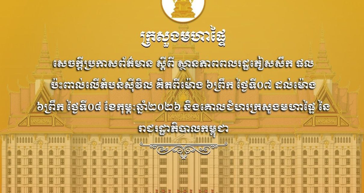 ទទួលការអនុញ្ញាតដ៏ខ្ពង់ខ្ពស់ពីសម្តេចមហាបវរធិបតី ហ៊ុន ម៉ាណែត នាយករដ្ឋមន្ត្រី នៃព្រះរាជាណាចក្រកម្ពុជា នាព្រឹកថ្ងៃចន្ទ ទី៩ ខែកុម្ភៈ ឆ្នាំ២០២៦ នេះ ឯកឧត្តមអភិសន្តិបណ្ឌិត ស សុខា ឧបនាយករដ្ឋមន្ដ្រី រដ្ឋមន្ដ្រីក្រសួងមហាផ្ទៃ បានអញ្ជើញដឹកនាំគណៈប្រតិភូក្រសួងមហាផ្ទៃ បំពេញទស្សនកិច្ច នៅសាធារណរដ្ឋតួកគីយ៉េ ក្នុងក្របខណ្ឌនៃការផ្លាស់ប្ដូរបទពិសោធលើការងារគ្រប់គ្រងសន្តិសុខ សណ្តាប់ធ្នាប់សាធារណៈ និងសុវត្ថិភាពសង្គម ចាប់ពីថ្ងៃទី៩ ដល់ថ្ងៃទី១៤ ខែកុម្ភៈ ឆ្នាំ២០២៦។