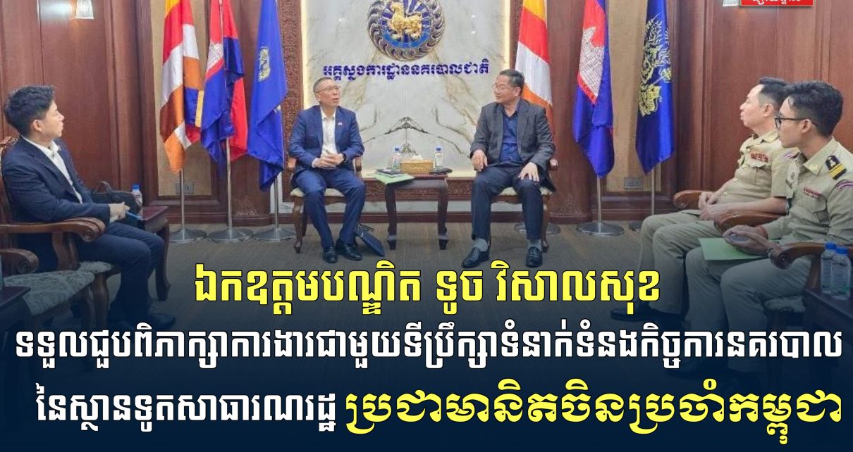 ឯកឧត្តមបណ្ឌិត ទូច វិសាលសុខ ទទួលជួបពិភាក្សាការងារជាមួយទីប្រឹក្សាទំនាក់ទំនងកិច្ចការនគរបាល នៃស្ថានទូតសាធារណរដ្ឋប្រជាមានិតចិនប្រចាំកម្ពុជា