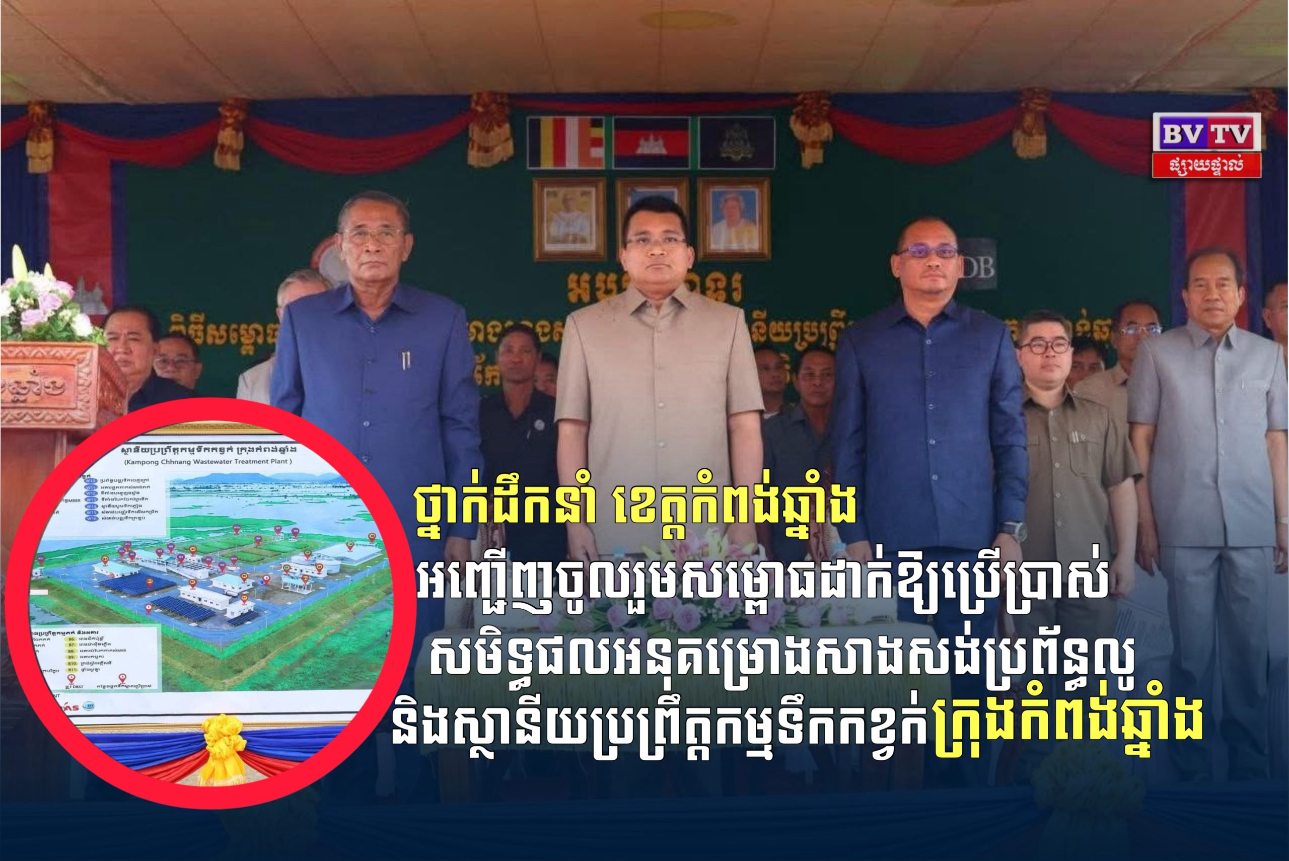 ខេត្តកំពង់ឆ្នាំង៖ នៅថ្ងៃសុក្រ ទី១០ ខែតុលា ឆ្នាំ២០២៥ ឯកឧត្ដម ស៊ីវ រុន ប្រធានក្រុមប្រឹក្សាខេត្ត និងឯកឧត្តម ស៊ុន សុវណ្ណារិទ្ធិ អភិបាលនៃគណៈអភិបាលខេត្តកំពង់ឆ្នាំង បានអមដំណើរឯកឧត្តម ប៉េង ពោធិ៍នា រដ្ឋមន្ត្រីក្រសួងសាធារណការ និងដឹកជញ្ជូន អញ្ជើញសម្ពោធដាក់ឱ្យប្រើប្រាស់សមិទ្ធផលអនុគម្រោងសាងសង់ប្រព័ន្ធលូ និងស្ថានីយប្រព្រឹត្តកម្មទឹកកខ្វក់ ក្រុងកំពង់ឆ្នាំង នៃគម្រោងកែលម្អគ្រប់គ្រងបរិស្ថានក្រុងជុំវិញបឹងទន្លេសាប ក្រោមឥណទានសម្បទានរបស់ធនាគារអភិវឌ្ឍន៍អាស៊ី។