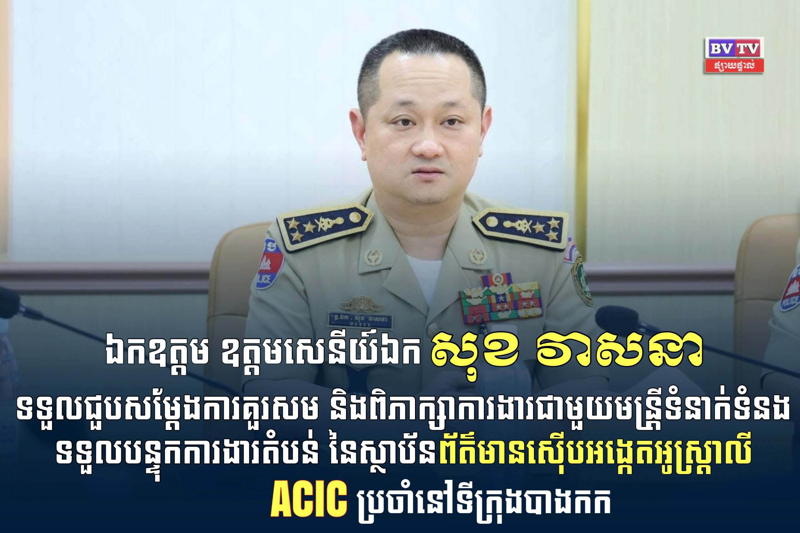 នៅរសៀលថ្ងៃទី១៤ ខែតុលា ឆ្នាំ២០២៥ ឯកឧត្តម ឧត្តមសេនីយ៍ឯក សុខ វាសនា អគ្គនាយក នៃអគ្គនាយកដ្ឋានអន្តោប្រវេសន៍ បានទទួលជួបសម្តែងការគួរសម និងពិភាក្សាការងារជាមួយលោក HUNTER McGee មន្រ្តីទំនាក់ទំនងទទួលបន្ទុកការងារតំបន់ នៃស្ថាប័នព័ត៌មានស៊ើបអង្កេតអូស្រ្តាលី ACIC ប្រចាំនៅទីក្រុងបាងកក ដោយមានវត្តមានចូលរួមពី ឯកឧត្តម អគ្គនាយករង លោកលោកស្រីប្រធាន-អនុប្រធាននាយកដ្ឋានពាក់ព័ន្ធ លេខាទូត និងមន្រ្តីទទួលបន្ទុកកិច្ចការបរទេសប្រចាំស្ថានទូតអូស្រ្តាលី ។