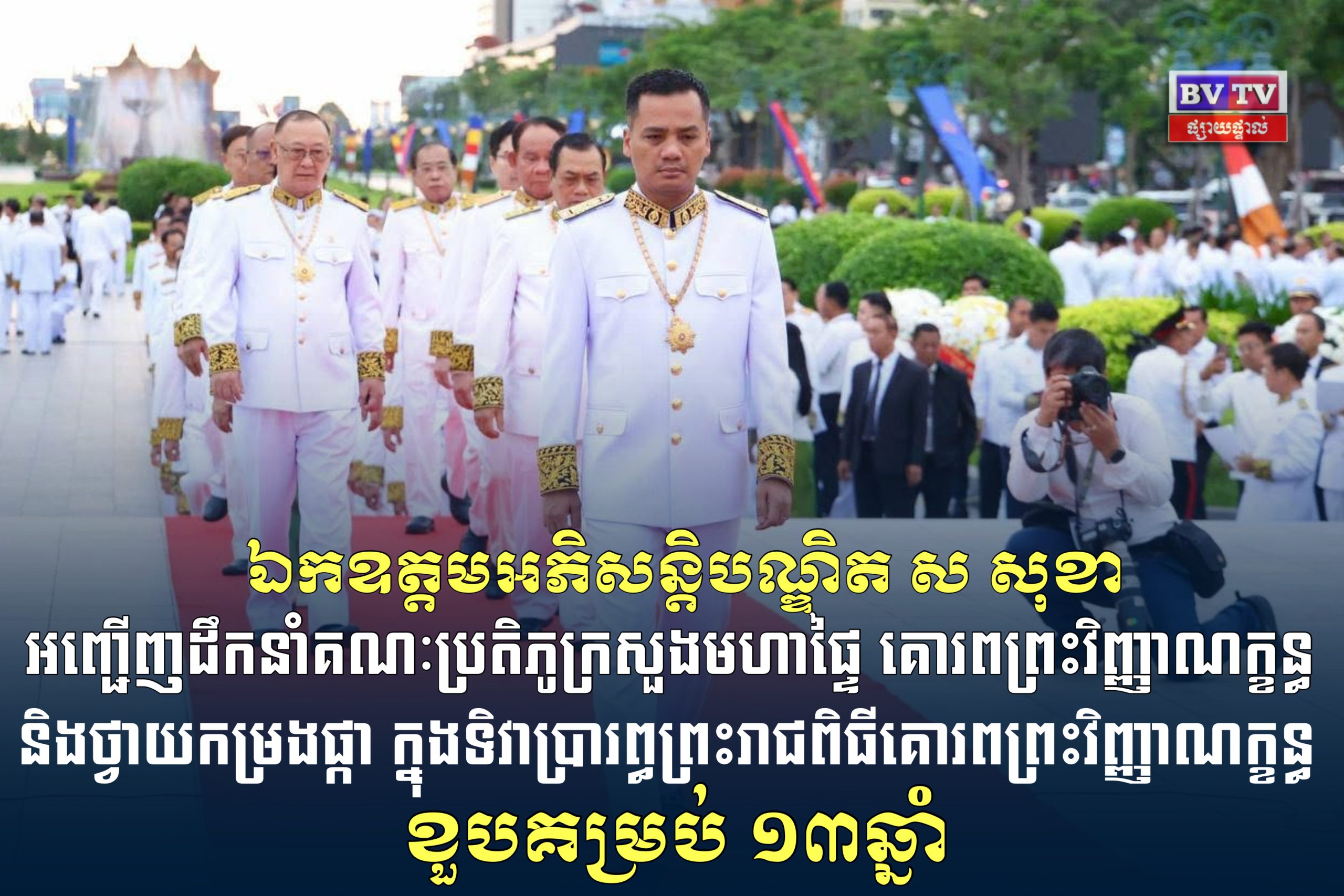 នៅព្រឹកថ្ងៃពុធ ទី១៥ ខែតុលា ឆ្នាំ២០២៥ នេះ ឯកឧត្តមអភិសន្តិបណ្ឌិត ស សុខា ឧបនាយករដ្ឋមន្ត្រី រដ្ឋមន្ត្រីក្រសួងមហាផ្ទៃ បានអញ្ជើញដឹកនាំគណៈប្រតិភូក្រសួងមហាផ្ទៃ គោរពព្រះវិញ្ញាណក្ខន្ធ និងថ្វាយកម្រងផ្កា ក្នុងទិវាប្រារព្ធព្រះរាជពិធីគោរពព្រះវិញ្ញាណក្ខន្ធ ខួបគម្រប់ ១៣ឆ្នាំ (១៥ តុលា ២០១២-១៥ តុលា ២០២៥) នៃការយាងសោយព្រះទិវង្គតរបស់ព្រះករុណាសម្តេចព្រះ នរោត្តម សីហនុ ព្រះមហាវីរក្សត្រ ព្រះវររាជបិតាឯករាជ្យ បូរណភាពទឹកដី និងឯកភាពជាតិខ្មែរ ព្រះបរមរតនកោដ្ឋ នៅមណ្ឌបព្រះបរមរូប វិមានឯករាជ្យ រាជធានីភ្នំពេញ។