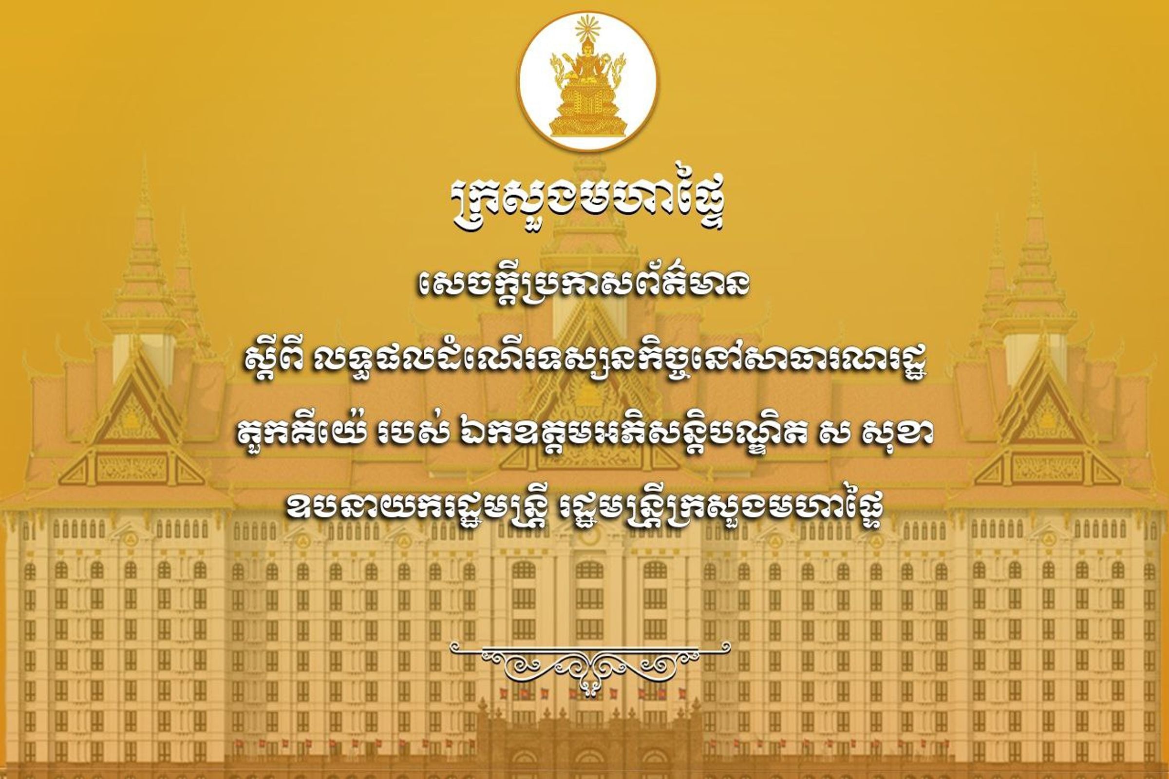 ក្រសួងមហាផ្ទៃ នៃរាជរដ្ឋាភិបាលកម្ពុជា សូមជម្រាបជូនថា ឯកឧត្តមអភិសន្តិបណ្ឌិត ស សុខា ឧបនាយករដ្ឋមន្ត្រី រដ្ឋមន្ត្រីក្រសួងមហាផ្ទៃ បានដឹកនាំគណៈប្រតិភូ មាតុភូមិនិវត្តន៍ ប្រកបដោយសុវត្ថិភាព នាព្រលប់ ថ្ងៃទី១៤ ខែកុម្ភៈ ឆ្នាំ២០២៦ បន្ទាប់ពីបំពេញទស្សនកិច្ច ប្រកបដោយជោគជ័យ នៅសាធារណរដ្ឋតួកគីយ៉េ ចាប់ពីថ្ងៃ ទី៩ ខែកុម្ភៈ ឆ្នាំ២០២៦។ ទស្សនកិច្ចនេះ ឆ្លុះបញ្ចាំងពីឆន្ទៈដ៏មុតមាំ របស់រាជរដ្ឋាភិបាលកម្ពុជា ក្រោមការដឹកនាំរបស់ សម្តេចមហាបវរធិបតី ហ៊ុន ម៉ាណែត ជានាយករដ្ឋមន្ត្រី ដែលបន្តផ្តល់សារសំខាន់ ចំពោះ មរតកកិច្ចសហប្រតិបត្តិការ ដ៏ល្អក្នុងវិស័យមហាផ្ទៃ រវាងរាជរដ្ឋាភិបាលកម្ពុជា ក្នុងនីតិកាលកន្លងទៅ ជាមួយរដ្ឋាភិបាលតួកគីយ៉េ។