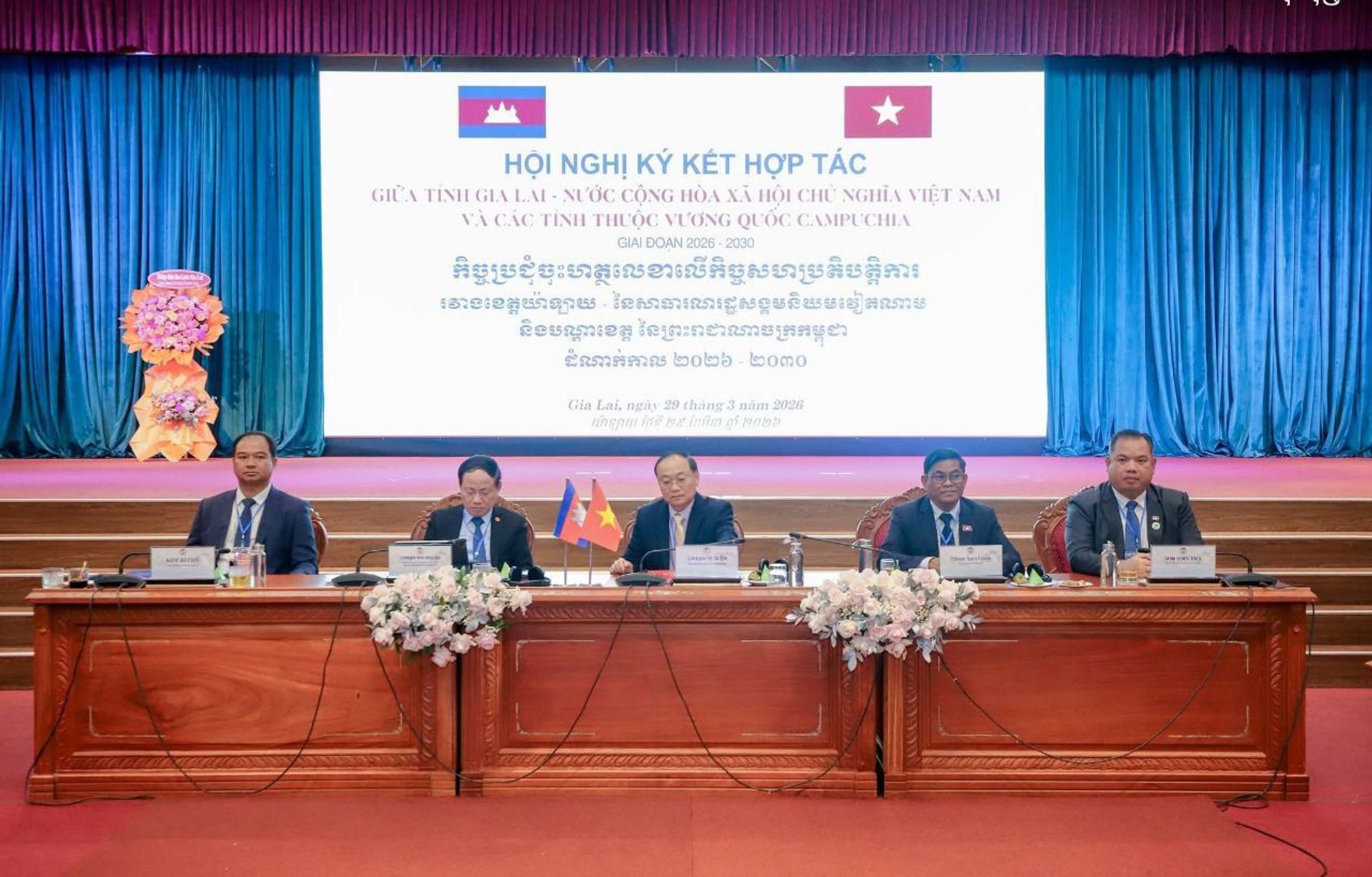 ឯកឧត្តម សរ សុពុត្រា អភិបាល នៃគណៈអភិបាលខេត្តស្ទឹងត្រែង ឯកឧត្តម ញ៉ែម សំអឿន អភិបាល នៃគណៈអភិបាលខេត្តរតនគិរី និងឯកឧត្តម គីម រិទ្ធី អភិបាល នៃគណៈអភិបាលខេត្តព្រះវិហារ បានអញ្ជើញក្នុងកិច្ចប្រជុំចុះហត្ថលេខាលើអនុស្សរណៈ ពង្រឹងនិងពង្រីកកិច្ចសហប្រតិបត្តិការល្អលើពហុវិស័យ ឆ្នាំ២០២៦ ដល់ឆ្នាំ២០៣០ ជាមួយខេត្តហ្សាឡាយ ប្រទេសវៀតណាម ដែលដឹកនាំដោយឯកឧត្តម ថៃ ដាយង៉ុក សមាជិកគណៈកម្មាធិការមជ្ឈិមបក្សកុម្មុនីស្ត វៀតណាម លេខាបក្សខេត្តហ្សាឡាយ ឯកឧត្តម ហ្វាម អាញ់ទ័ន សមាជិកគណៈកម្មាធិការមជ្ឈិមបក្សកុម្មុនីស្តវៀតណាម អនុលេខាបក្សខេត្ត និងជាប្រធានគណៈកម្មាធិការប្រជាជនខេត្តហ្សាឡាយ ដែលពិធីនេះបានប្រព្រឹត្តិទៅនារសៀលថ្ងៃទី២៩ ខែមីនា ឆ្នាំ២០២៦ ដោយមានការអញ្ជើញចូលរួម លោកជំទាវ ឯកអគ្គរាជទូតវិសាមញ្ញ និងពេញសមត្ថភាព នៃព្រះរាជាណាចក្រកម្ពុជា ។