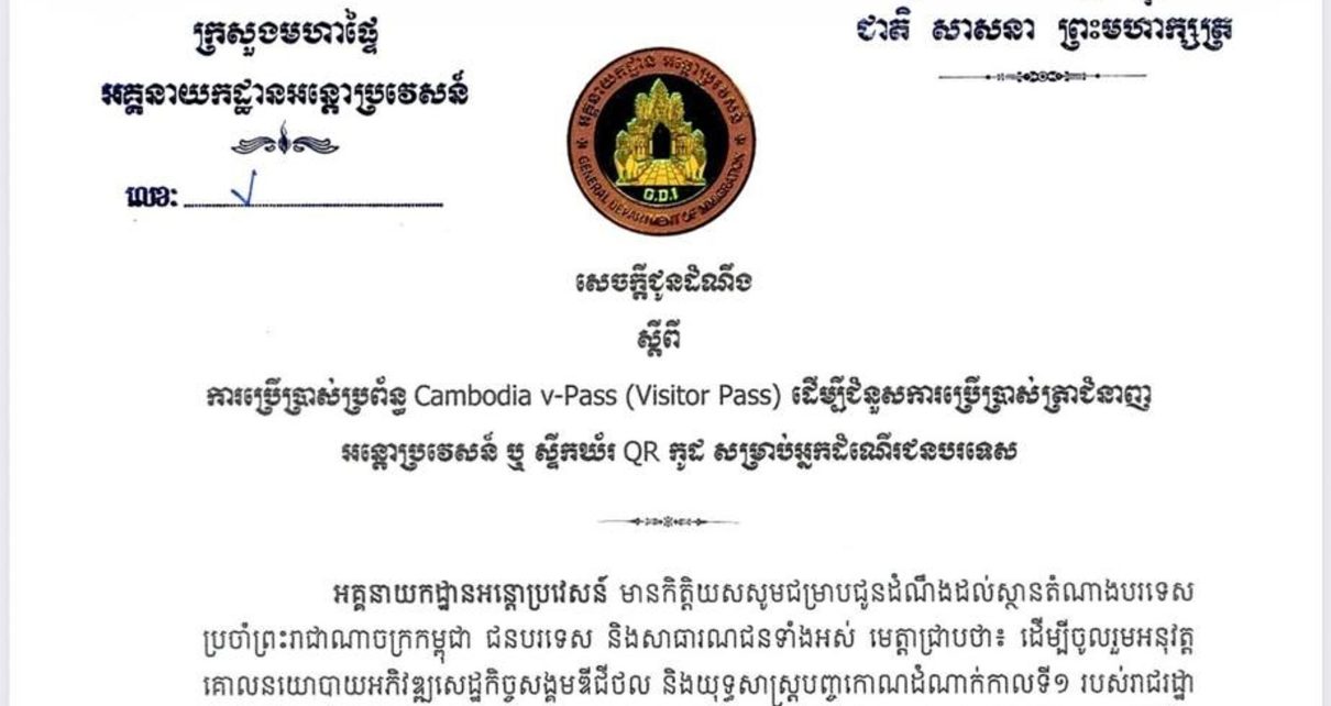 អគ្គនាយកដ្ឋានអន្តោប្រវេសន៍ បានចេញសេចក្តីជូនដំណឹងស្ដីពីការដាក់ឱ្យប្រើប្រាស់ប្រព័ន្ធ Cambodia v-Pass (Visitor Pass) ដើម្បីជំនួសការប្រើប្រាស់ត្រាអន្តោប្រវេសន៍ ឬស្ទីកឃ័រ (QR Code) សម្រាប់អ្នកដំណើរជនបរទេស។
